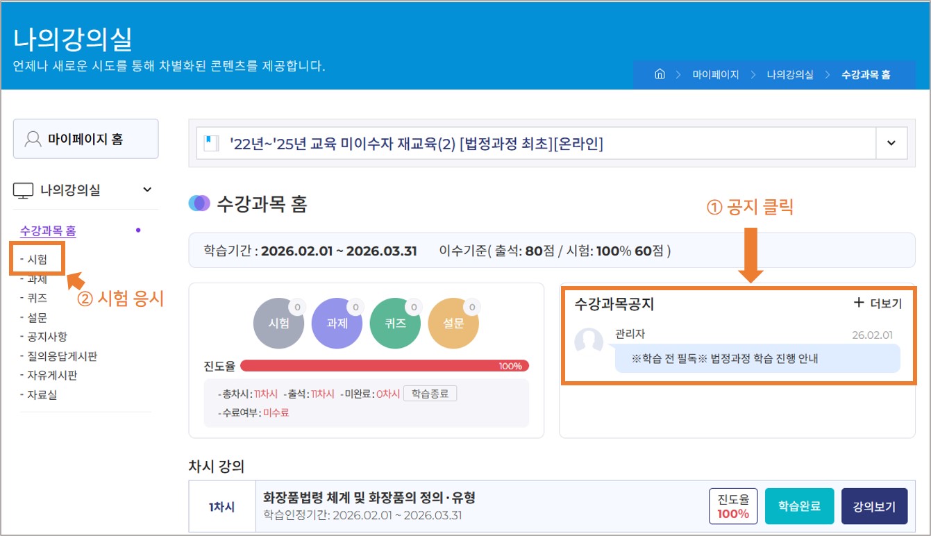 '22년~'25년 교육 미이수자 재교육 과정의 원활한 진행을 위해 강의실 내 공지사항 게시판에 학습 진행과 관련한 공지 글이 게재되어 있습니다.